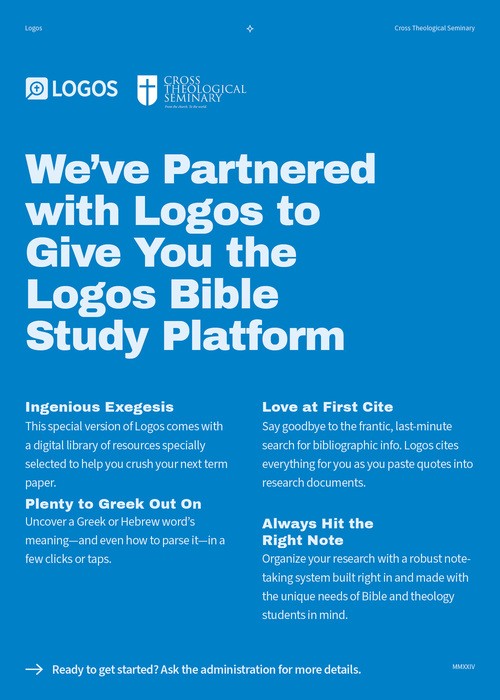 Cross Theological Seminary utilizes a 100% digital library to ensure the academic success of our students. Our primary partner is Logos Academic Solutions. Through our partnership with Logos, Cross Theological Seminary has curated a customized theological library with all the tools and texts needed for every class and every assignment. Students gain access to the full Cross Theological Seminary Library on day one and will take the Logos customized library with them when they graduate. It is theirs...for life